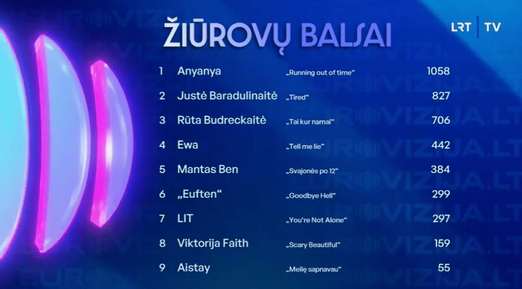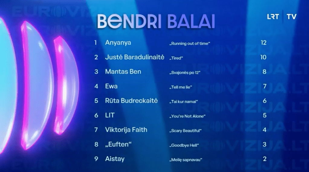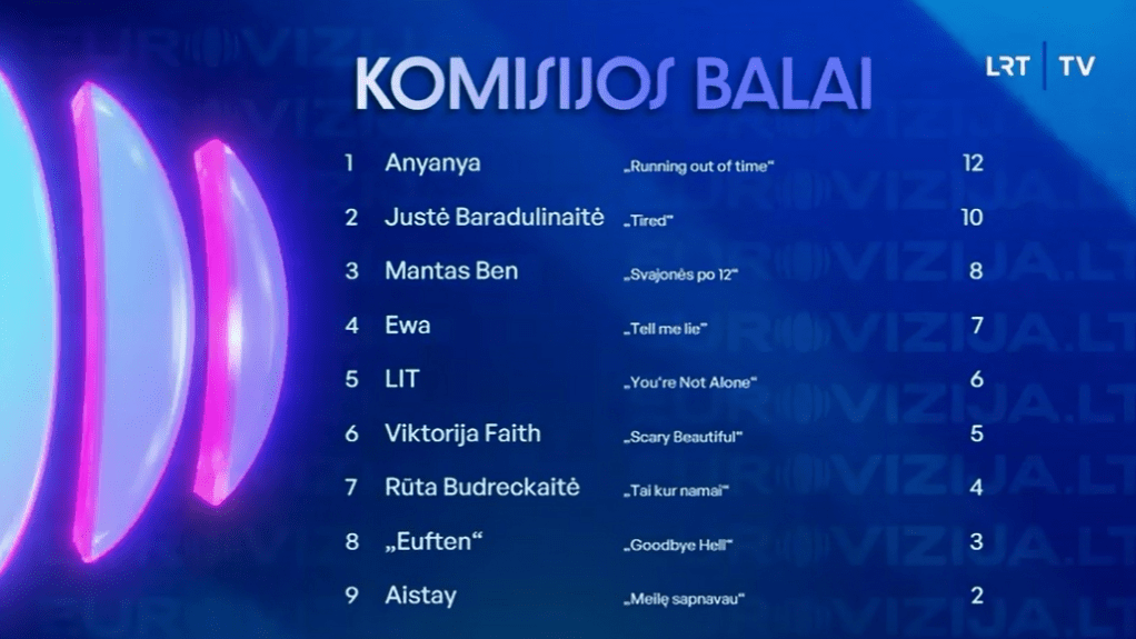 ברוכים הבאים לטרום הגמר ראשון של הקדם הליטאי, ה-Eurovizija.LT. הפורמט עצמו כולל חמישה טרומי גמר, וגמר. בשנה שעברה סיימה המדינה במקום ה-14 בגמר, עם השיר "Luktelk" של Silvester Belt. האם השנה יש לליטא את השיר שיזניק אותה גבוה בתחרות?