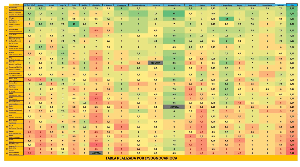העיתונאים האזינו לשירי פסטיבל סנרמו 2025. להלן התפלגות הציונים שנתנו לשירים: