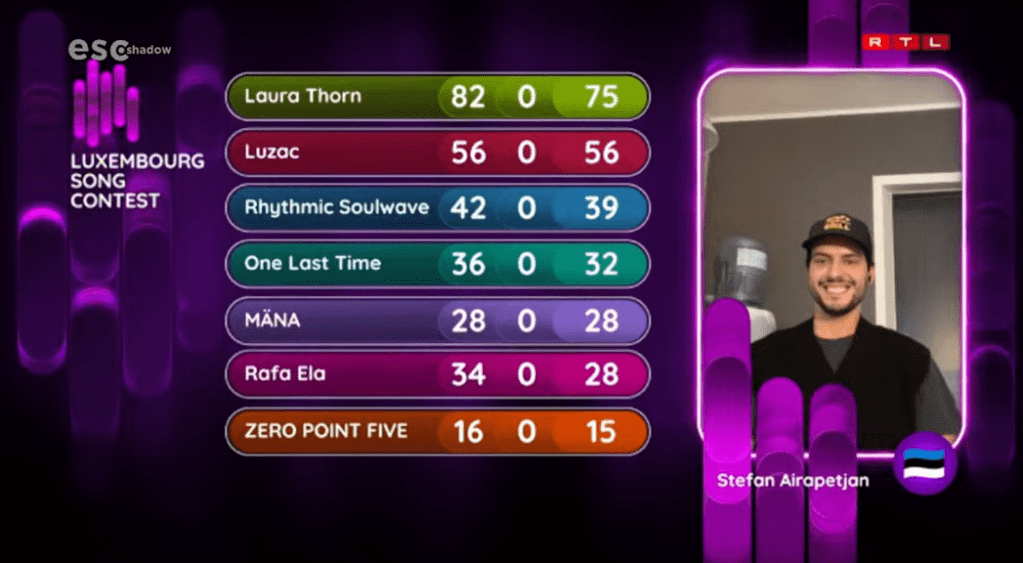 Laura Thorn – Le poupée monte le son – בסקירת השירים כתבתי: "השיר נכתב בהשראת "Poupée de Cire, Poupée de Son" של France Gall, זוכה אירוויזיון 1965. השיר מתחיל בצלילים דרמטיים וממשיך באנרגיה גבוהה. לזמרת קול דק, מה שהולך יפה עם השפה הצרפתית. הפזמון פופי-שלאגרי עם הרגשה ניינטיזית. אפשר להגיד שהבתים חזקים יותר ומבטיחים יותר, מה שהפזמון מתקשה לקיים. זה מאד נוסחתי, מיידי ומתנפל על המאזין, אבל זה לא רע לחלוטין. גילטי פלז'ר עם תרצו. 3/5."