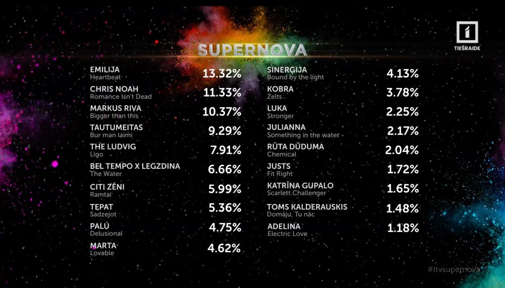 ברוכים הבאים לחצי הגמר של הקדם הלטבי, ה-Supernova. בחצי הגמר 19 שירים, המתמודדים על עשרה מקומות בגמר. בשנה שעברה לטביה שלחה את "Hollow" של Dons, אשר העפיל לגמר אחרי 7 שנים שחונות של לטביה, וסיים בו במקום ה-16.