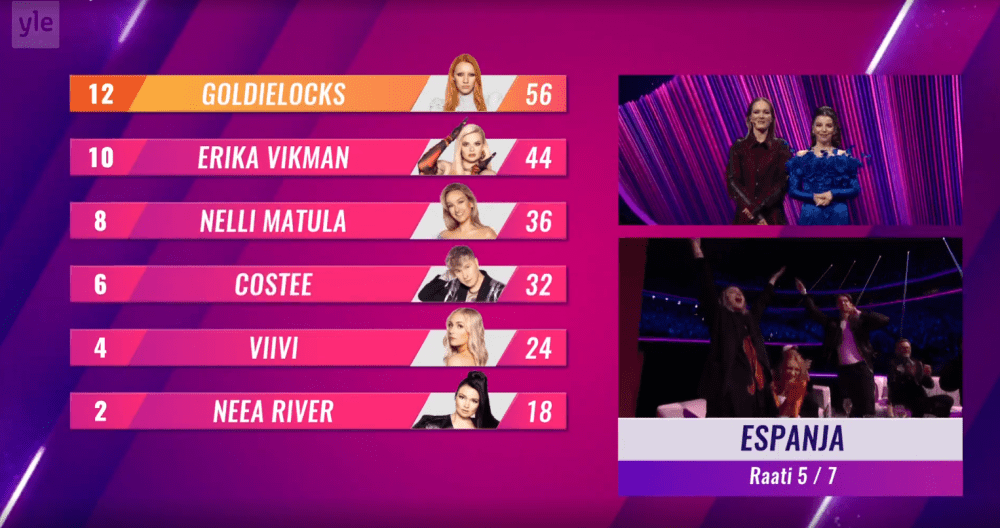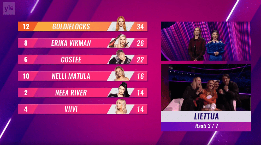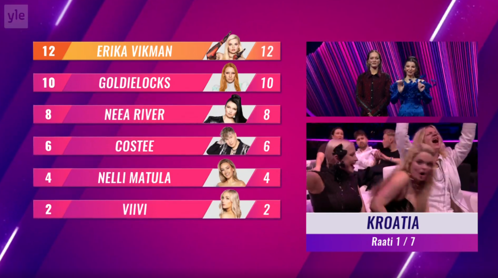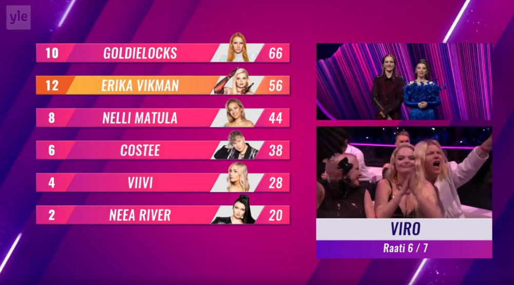 אמש פינלנד בחרה! ה-Uuden Musiikin Kilpailu כולל שישה שירים. הזוכה יוכרע על ידי 25% שופטים בינלאומיים ו-75% קהל. הקדם נערך בהיכל נוקיה, בטמפרה, פינלנד.