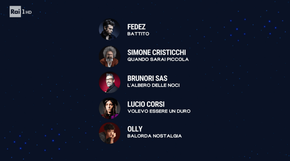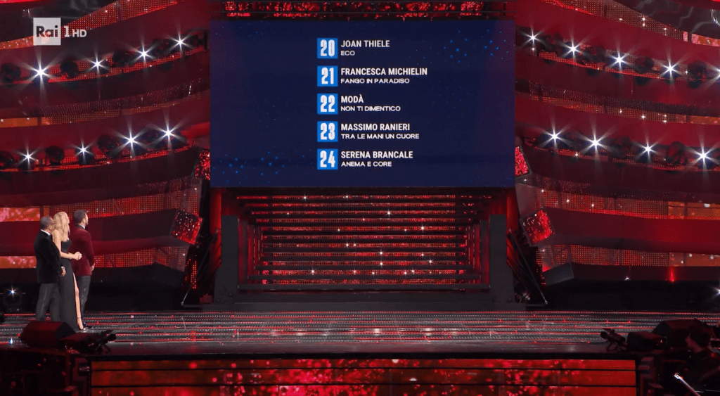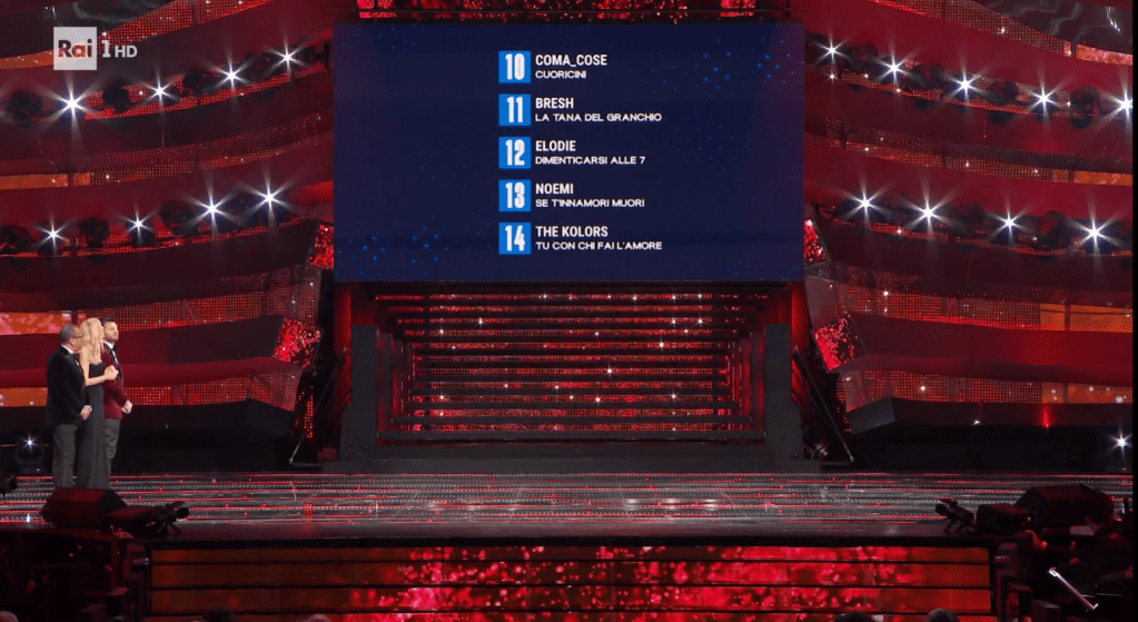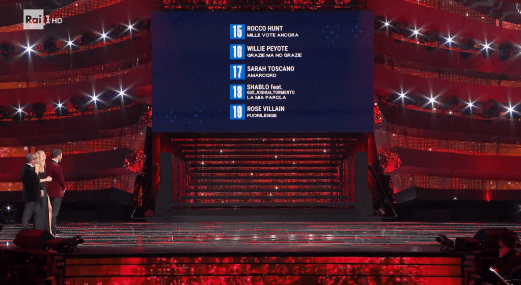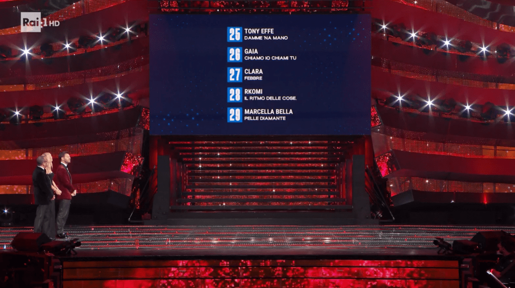 יש קריאות בוז מהקהל כשמתגלה ש-Achile Lauro ו-Giorgia מחוץ למירוץ. מקומות 1-5 בסדר אקראי: