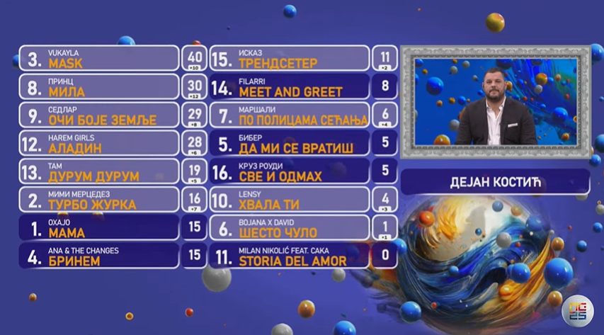 במופע הביניים, שידור חוזר של מופע הביניים מגמר הקדם בשנה שעברה ולפני שנתיים: Luke Black מבצע את "Samo mi se spava", ו-Konstrakta עם מחרוזת של שני שירים.