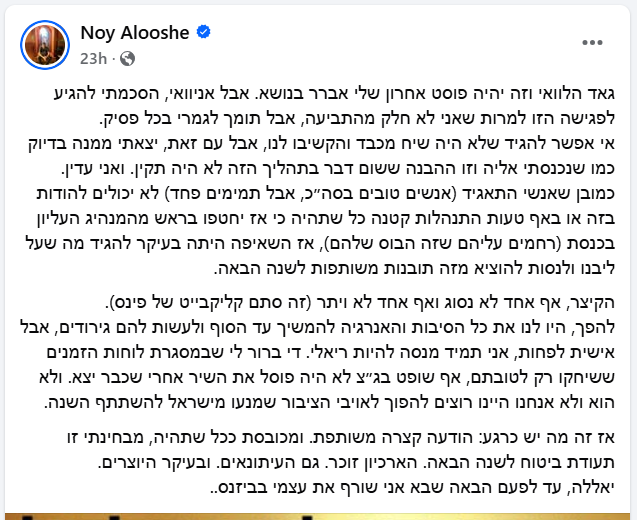 נוי אלוש הציג את הדברים בעמוד הפייסבוק שלו בצורה קצת שונה: