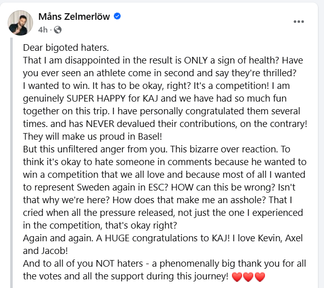 בפוסט שפרסם בעמוד הפייסבוק שלו, Måns Zelmerlöw הביע אכזבה טבעית מהתוצאה, תוך שהוא מדגיש שזה לגיטימי לרצות לנצח בתחרות. עם זאת, הוא הדגיש את שמחתו הכנה עבור Kaj, הזוכים, וציין כי הוא גאה בהם ושמח עבורם. בפוסט, הוא גם מתח ביקורת על ההתקפות והשנאה שהופנו כלפיו ברשתות החברתיות בעקבות תגובתו להפסד. הוא תהה מדוע הרצון לנצח גורם לו להיחשב בעיני חלק מהאנשים כ"שחצן" או "רע", וציין כי הבכי שלו אחרי ההפסד נבע משחרור של לחץ מצטבר, ולא מחוסר כבוד כלפי המנצחים. לסיום, הוא חזר להדגיש את תמיכתו בזוכים, הודה לכל מי שתמך בו, ושלח מסר נגד השנאה ברשתות: