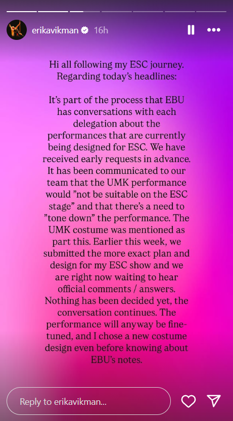Vikman לאחר מכן חזרה על הדברים וציינה כי הם כן נאלצו לעשות מספר שינויים וכי ההופעה עדיין לא אושרה באופן סופי: