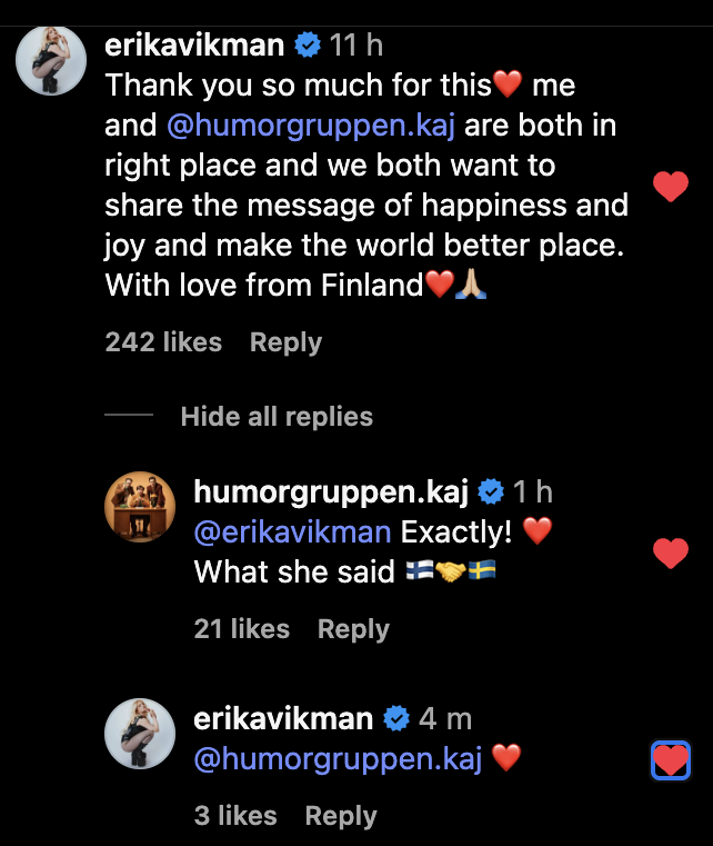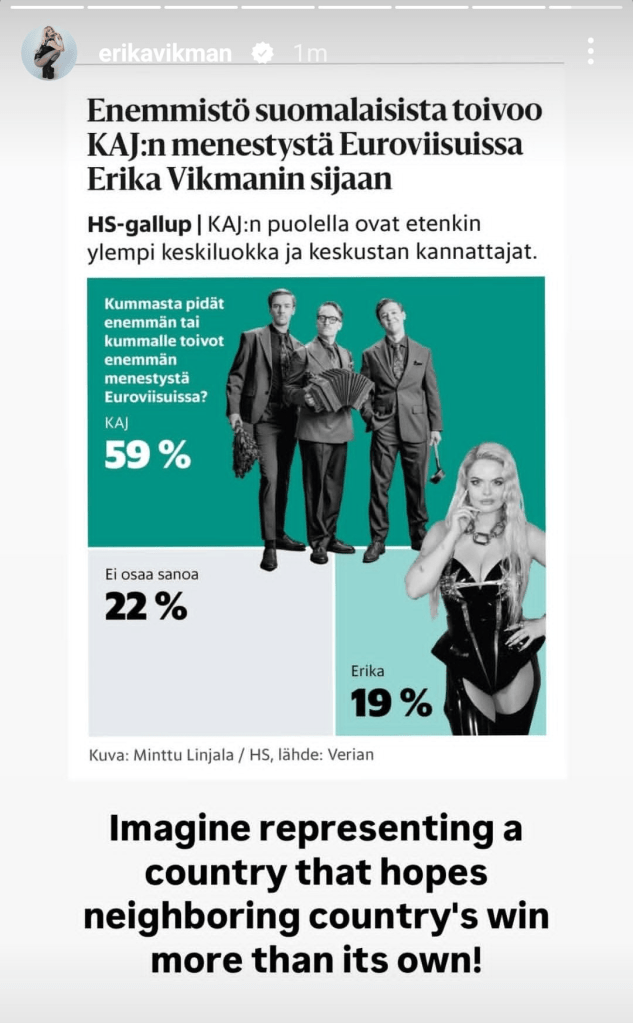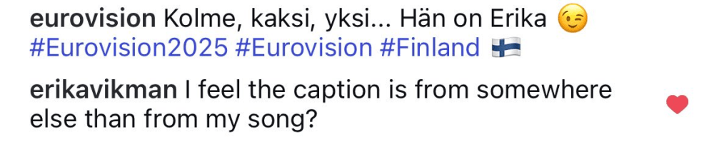 וגם הערוץ הרשמי של האירוויזיון יצא עם caption די משפיל, שבו הוא מצטט את השיר השבדי בקליפ החזרה של פינלנד. Vikman הגיבה באכזבה: