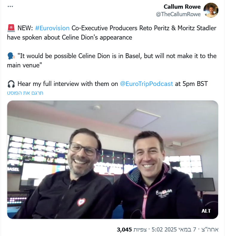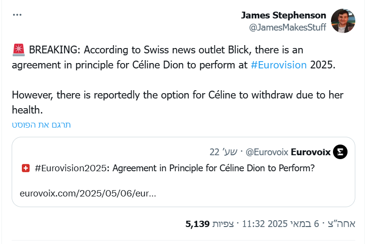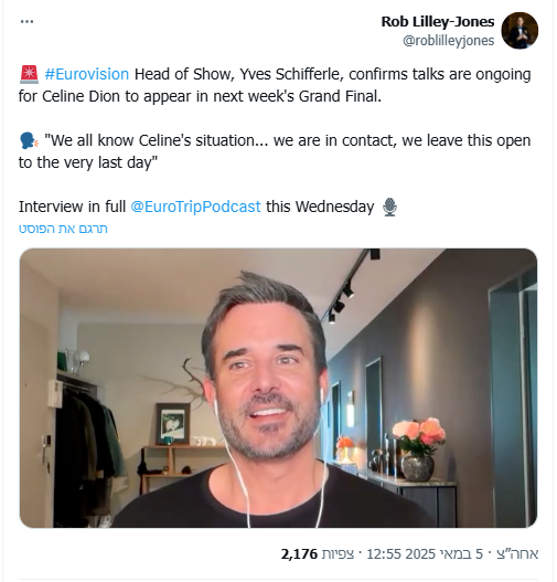 * העיתון השווייצרי Le Matin מדווח כי Celine Dion מוזכרת פעמיים בתסריטי ההופעות של אירוויזיון 2025. בחצי הגמר הראשון צפוי קטע מחווה לזמרת, ובגמר הגדול שמור לה מקטע נוסף שאורכו כשתי דקות – תכנו לא פורסם. עם זאת, מציין העיתון, התסריטים משתנים לעיתים קרובות ועדיין יש זמן לשינויים. מצבה הבריאותי של סלין נותר שברירי. מקור. לאחר מכן דיווח Blick כי יש הסכם עם Dion על ההופעה באירוויזיון, כאשר היא יכולה לפרוש ברגע האחרון עקב בעיות הבריאות מהן היא סובלת:
