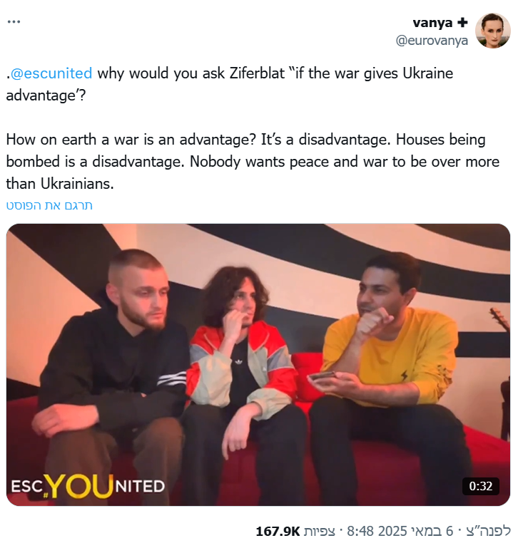 רגע של קרינג'. מראיין של אחד מאתרי החובבים הגדולים שאל את נציגי אוקראינה האם הם חושבים שזה שהמדינה שלהם במלחמה נותן להם יתרון בתחרות: