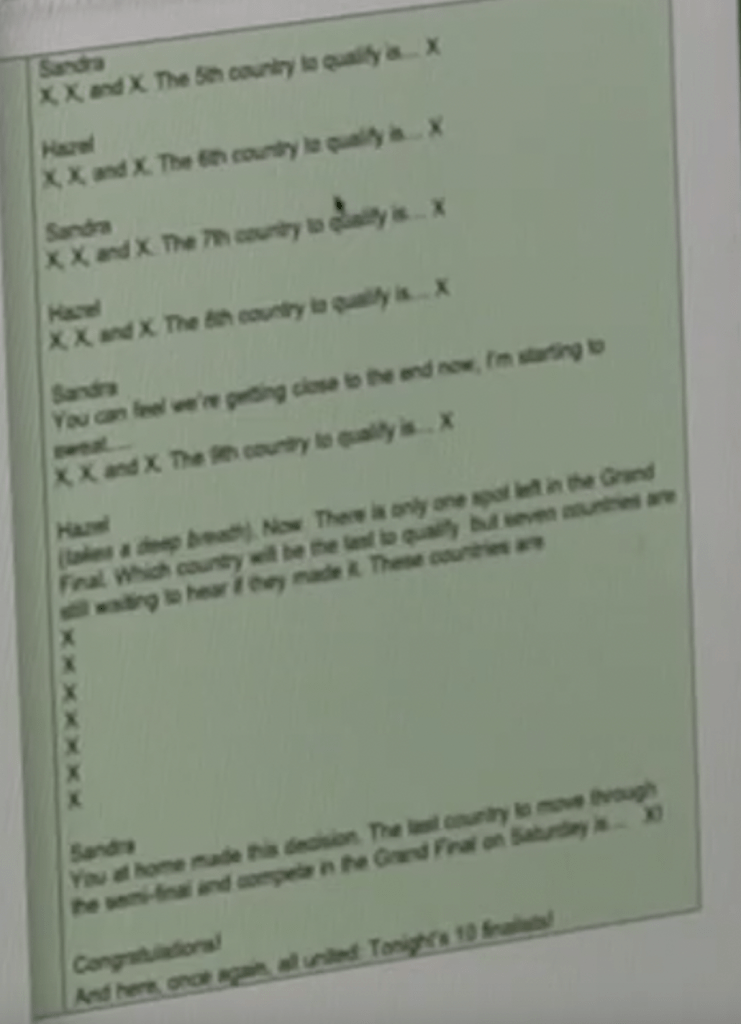 לפי צילום של התסריט מתוך כתבה של הטלוויזיה השווייצרית, נראה כי בשלב ההכרזה על התוצאות בחצאי הגמר, המנחים יקראו שלוש מדינות בכל פעם, כשאחת או שתיים מהן יעלו בפועל, ולאחר מכן ימשיכו באותו אופן עם יתר המדינות.