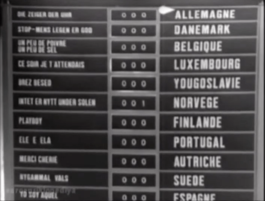 פורטוגל – הניסיון של פורטוגל להיות מודרנים אחרי שתי בלדות מדהימות ששלחו וכשלו איתן. הם מקבלים יותר נקודות משנה שעברה, אבל מסיימים באותו מקום בטבלה. זה טייק אוף שמרני על שיר פופ קצבי, שזה כנראה מה שניתן היה לשיר בפורטוגל הפאשיסטית של סלאזר. ולמרות הכל, זו קלאסיקה גדולה בפורטוגל.