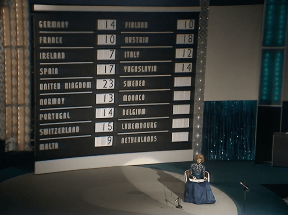 לאחר ההצבעה של גרמניה, צרפת ואירלנד: לוקסמבורג מובילה עם 26, בריטניה שנייה עם 23, הולנד שלישית עם 20, אוסטריה רביעית וספרד חמישית. אחרי ההצבעה של ספרד, בריטניה ונורבגיה: לוקסמבורג מובילה עם 46, הולנד קופצת למקום השני עם 45, בריטניה שלישית עם 35, גרמניה רביעית ויוגוסלביה חמישית. אחרי ההצבעה של פורטוגל, שווייץ ומלטה: לוקסמבורג ראשונה עם 63 נקודות, הולנד שנייה עם 59, בריטניה, אוסטריה וגרמניה במקום השלישי. אחרי ההצבעה של פינלנד, אוסטריה ואיטליה: לוקסמבורג בראש עם 86 נקודות, הולנד שנייה עם 77, בריטניה שלישית עם 70, גרמניה רביעית ואוסטריה חמישית. אחרי ההצבעה של יוגוסלביה, שבדיה ומונקו: לוקסמבורג פותחת פער עם 111 נקודות, הולנד שנייה עם 97, בריטניה שלישית עם 94, גרמניה רביעית ואוסטריה חמישית. לאחר ההצבעה האחרונה של בלגיה, לוקסמבורג והולנד: לוקסמבורג מנצחת ואחריה בריטניה, גרמניה, הולנד ואוסטריה.