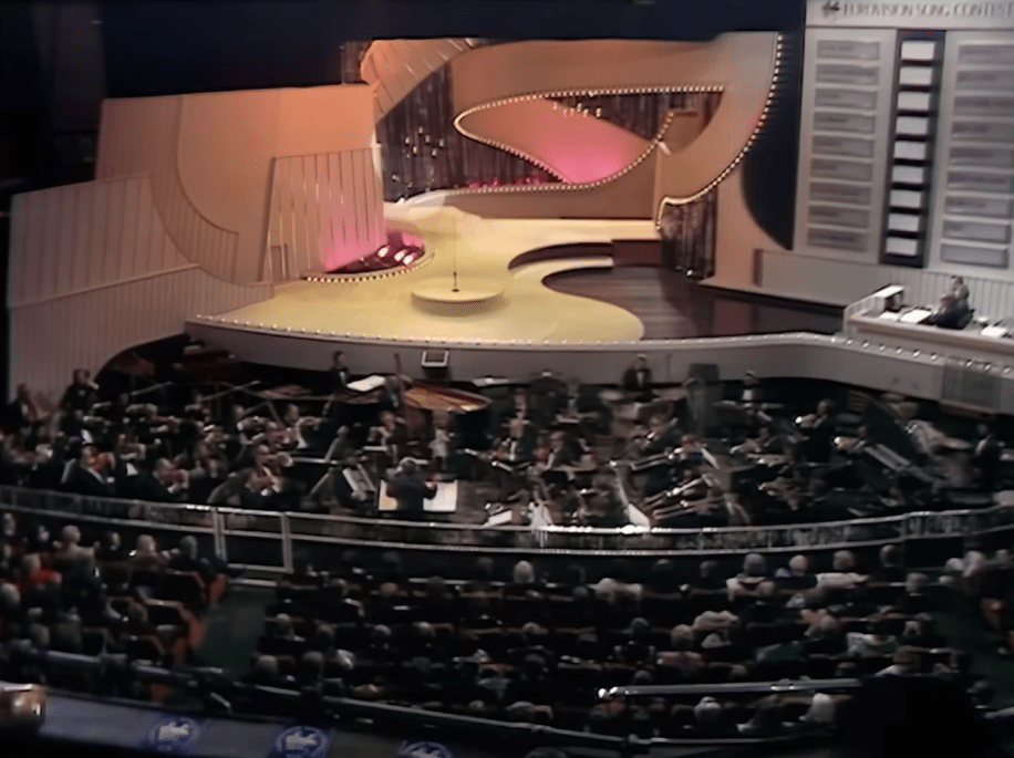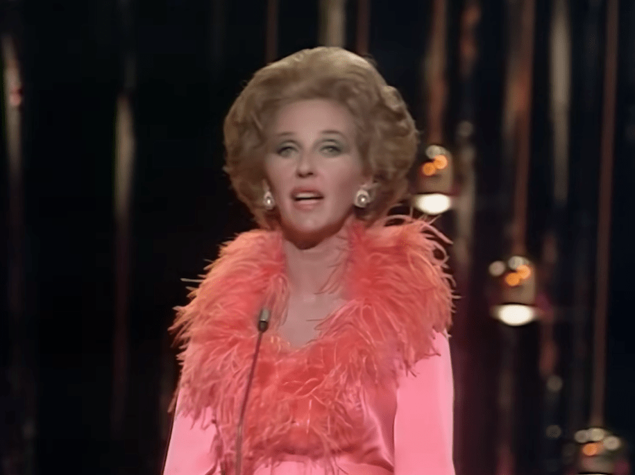 Katie Boyle חוזרת והיא נראית כמו המאדאם עם שיער מנופח, איפור כבד וספק שמלה ספק כותונת לילה ורודה עם צאוורון נוצות מחריד. תודה לאל שזו הפעם האחרונה שבה נראה אותה.