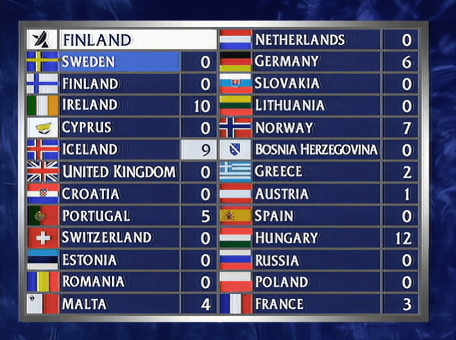 ההצבעה השבדית שמה את הונגריה במקום הראשון. הונגריה מקבלת 12 נקודות מ-3 המדינות הראשונות להצביע. אחרי 3 מצביעות, הונגריה מובילה ואחריה מלטה ופורטוגל. ההצבעה הקפריסאית מאפסת את הונגריה, מעלה את אירלנד למקום השני. ההצבעה האיסלנדית זוכה תחילה לבוז, ככל הנראה מנורבגים ושבדים בקהל, שכן הם מעניקים מעט נקודות לשכנות מסקנדינביה. הקריאות מתחלפות בשאגת שמחה של הקהל המקומי עם קבלת אירלנד את ה-12 הנקודות הראשונות שלה לערב זה. ההצבעה האיסלנדית מעלה את גרמניה למקום השלישי, בעוד הונגריה ואירלנד פותחות פער. ההצבעה הבריטית מעלה את פורטוגל ופולין למקום השלישי בשיוויון עם גרמניה ומצמצמת את הפער בין הונגריה ואירלנד לנקודה בודדה. ההצבעה הקרואטית מקפיצה את אירלנד למקום הראשון, וכך זה יישאר עד סוף הערב. ההצבעה הפורטוגלית מעלה את גרמניה למקום השני בשיוויון עם הונגריה ומגדילה את הפער בין אירלנד לשאר. ההצבעה השווייצרית מעלה את פולין למקום השני. רגע של מבוכה כאשר נראה שהמנחה דוחק בדוברת האסטונית, שנראית פגועה וכועסת. הקהל פורץ בצחוק. הפער בין אירלנד לפולין עומד על 22 נקודות. אחרי ההצבעה הרומנית, גרמניה קופצת למקום השלישי. איך שהטופ 5 נראה כעת, כך זה גם הולך להסתיים. אירלנד בורחת מהשאר, כאשר פולין חזק במקום השני, הונגריה וגרמניה נאבקות על המקום השלישי בעוד מלטה גם היא חזקה במקום החמישי. הדובר המלטי נראה מגוחך בטוקסידו, כשלצידו שריון של אביר. הקהל מגחך. זה כנראה ההצבעה השערורייתית אי פעם בתחרות: המלטים מנקדים את רומניה, שווייץ, קרואטיה וסלובקיה בניקוד גבוה אחרי שכל הערב קיבלו 0 עגול משאר השופטים. בוז מהקהל כשאירלנד מקבלת רק 5 נקודות. ההצבעה ההולנדית מעלה את הונגריה למקום השלישי. אירלנד לא מפסיקה לקבל 12 נקודות והיא נמצאת כעת במרחק של 32 נקודות מפולין. ההצבעה הליטאית מעלה את גרמניה בחזרה למקום השלישי. ההצבעה הנורבגית מחזירה את הונגריה למקום השלישי. לקראת ההצבעה הבוסנית, הקהל מריע, ונותנת הנקודות הבוסנית מתרגשת מאד. ההצבעה הפינית מרימה את פינלנד מהמקום האחרון, שמה את הונגריה וגרמניה בשיוויון במקום השלישי ומגדילה את הפער בין אירלנד לבין פולין ל-40 נקודות. ההצבעה היוונית מעלה את אסטוניה מהמקום האחרון. ההצבעה היוונית שערורייתית כמעט כמו זו המלטית, וכמובן מקבלת קריאות בוז לאחר ש-12 הנקודות ניתנות לקפריסין ואירלנד מאופסת. הצבעה זו מעלה את מלטה למקום השלישי, אך מלטה לא תקבל נקודות משלב זה ואילך. ההצבעה האוסטרית מעלה את הונגריה למקום השלישי ומרימה את הולנד מהמקום האחרון. ההצבעה הספרדית מעלה את גרמניה למקום השלישי ומאפסת את פולין. תיאורטית פולין כבר לא יכולה לעקוף את אירלנד, אך המנחה מתעקש שכן… בהצבעה ההונגרית, מקבל את פנינו בחור מבוגר וכבד עם כוס ויסקי (?). אחרי ההצבעה ההונגרית, הפער בין אירלנד לפולין הוא 50 נקודות כעת. ההצבעה הרוסית מעלה, לראשונה בתולדות התחרות, מדינה מעבר לקו 200 הנקודות. מדובר כמובן באירלנד. אירלנד זוכה, פולין שנייה, גרמניה שלישית, הונגריה ומלטה חותמות את הטופ 5.