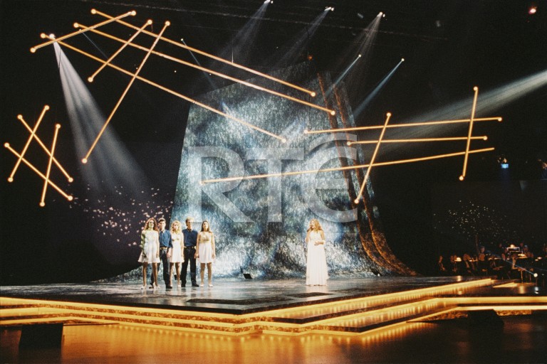 דבלין, אירלנד. התחרות ה-40 במספר של האירוויזיון נפתחת בנופי אירלנד, צילומים מתחלפים במהירות על רקע מוזיקה משתנה המציגה את המגוון והעושר התרבותי שלאירלנד יש להציע. הכל מאד תזזיתי, כיאה לדור ה-MTV. לאחר מכן אלומות אור על אלפי הצופים בקהל, ואז רטרוספקטיבה על תחרויות העבר, אני מאד מעריך מחוות היסטוריות כאלה. עוברים על שנים במהירות. דנה האירית זוכת 1970 זוכה לתשואות רמות, כמו גם ABBA, Brotherhood of Men, Celine Dion, Linda Martin, Niamh Kavanagh ו-Paul Harrington ו-Charlie McGettigan בגזרה הישראלית יש שוט של שוקולד מנטה מסטיק ומשמיעים את "אבניבי" של יזהר כהן. המסך עולה והמנחה צועדת פנימה, יורדת על גבי גרם מדרגות שמתרומם אף הוא ונעלם. הבמה חשוכה מוארת בכחול, בצורת חץ היורד מלמעלה למטה. שתי במות קטנות בצורת ראש חץ לצידי הבמה. הבמה תתקשט באפקטי תאורה שונים בכל שיר, אבל לא מספיק שונים.