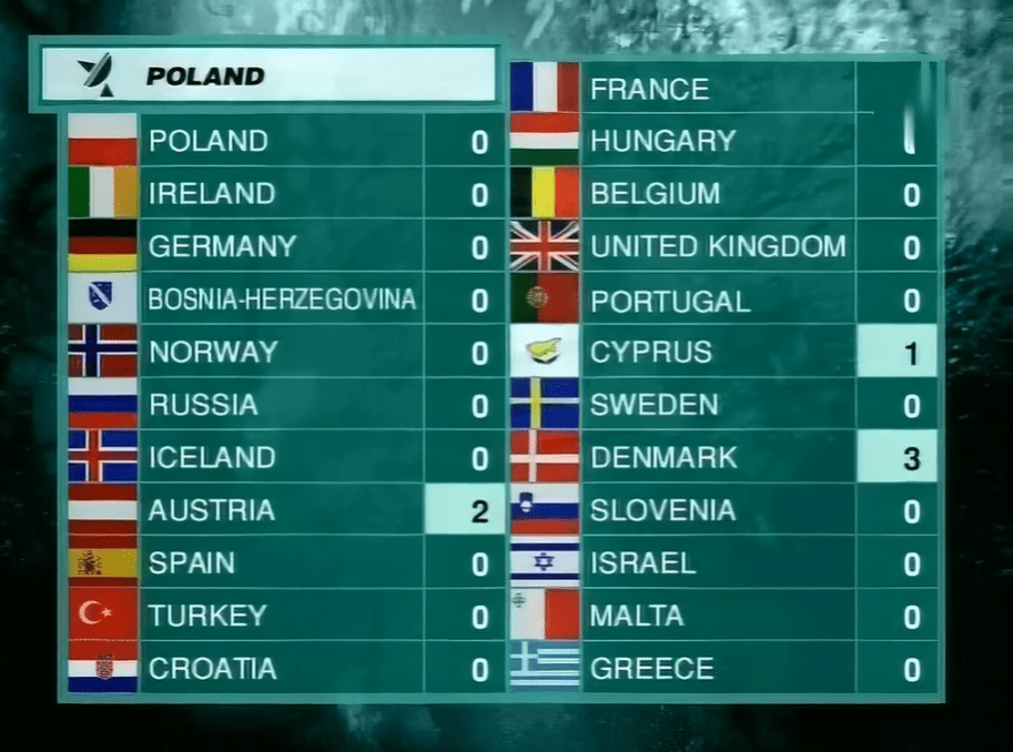 ההצבעה הקרואטית מתעלמת מנורבגיה, דנמרק ושבדיה ומעלה את מלטה (!) למקום הרביעי. ההצבעה הצרפתית מתעלמת מדנמרק, מעלה את ספרד למקום החמישי וגורמת לנורבגיה לפתוח פער של 11 נקודות משבדיה. ההצבעה ההונגרית מתעלמת משבדיה ומעלה את צרפת למקום הרביעי. ההצבעה הבלגית מתעלמת משבדיה ומעלה את דנמרק וספרד לשוויון במקום השני. נורבגיה מובילה בפער של 20 נקודות. ההצבעה הבריטית מורידה את שבדיה למקום השלישי ומתעלמת מדנמרק, צרפת יורדת למקום החמישי. ההצבעה הפורטוגלית מגדילה את הפער בין נורבגיה לשאר – 21 נקודות הפרש בין נורבגיה לספרד. ההצבעה היוונית מעלה את מלטה למקום החמישי על חשבון צרפת. המנחה שוב אומרת שהשיר המוביל הוא "נוסטלגיה" ומיד לאחר מכן מתקנת ל"נוקטורן". ההצבעה השבדית מתעלמת מנורבגיה ומספרד ומעלה את דנמרק למקום השלישי. ההצבעה הדנית נותנת רק 2 נקודות לנורבגיה ומעלה את צרפת למקום החמישי ואת שבדיה בחזרה למקום השני. ההצבעה הסלובנית מתעלמת מספרד ומעלה את הפער בין נורבגיה לשבדיה ל-23 נקודות. ההצבעה הישראלית מעלה את צרפת לשיוויון במקום הרביעי עם דנמרק, מעלה את ספרד למקום השני, אך גם נותנת 10 נקודות לנורבגיה ומתעלמת משבדיה מה שחותם את הניצחון הנורבגי. ההצבעה היוונית מורידה את דנמרק למקום החמישי ושמה את הדובדבן על עוגת הניצחון הנורבגי. נורבגיה מנצחת בפעם השנייה, ספרד שנייה, שבדיה שלישית, צרפת ודנמרק חותמות את הטופ 5.