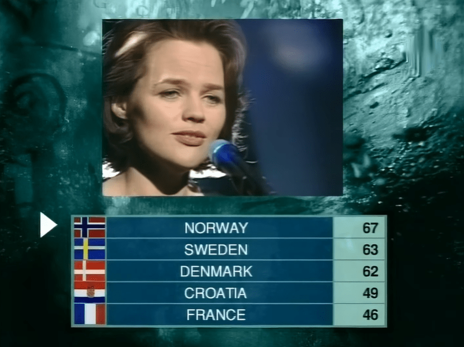 ההצבעה הבוסנית נותנת רק נקודה 1 לשבדיה ו-2 לנורבגיה ומעלה את ספרד למקום השלישי. לאחר ההצבעה הנורבגית, דנמרק עולה למקום השני על חשבון נורבגיה. ההצבעה הרוסית מצמצמת את הפער בין שבדיה לדנמרק ל-8 נקודות. ההצבעה האיסלנדית מעלה את נורבגיה למקום השני, רק 3 נקודות מאחורי שבדיה. ההצבעה האוסטרית מתעלמת מנורבגיה ומעלה את דנמרק בחזרה למקום השני. ההצבעה הספרדית מחולקת בעיקר לחברות הים תיכוניות, היא מתעלמת משבדיה ודנמרק ומעלה את קרואטיה למקום החמישי. ההצבעה הטורקית מעלה את קרואטיה למקום הרביעי ואת נורבגיה למקום הראשון, כאשר שם היא תישאר עד סוף הערב. נורבגיה מובילה עם 67, שבדיה שנייה עם 63 ודנמרק שלישית עם 62. המנחה מתבלבלת ואומרת שנורבגיה מובילה עם השיר "נוסטלגיה", שהוא כאמור השיר הקרואטי.