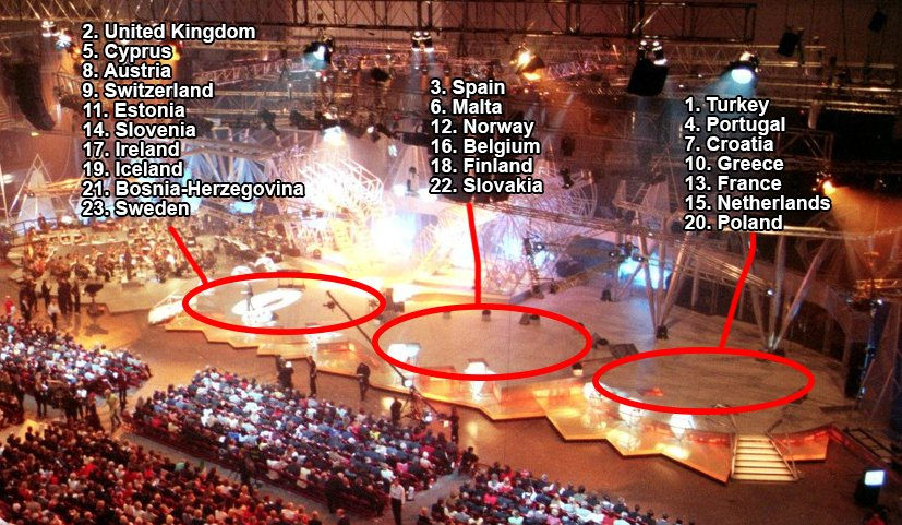 הבמה חולקה ל-3 חלקים, וההופעות של המדינות שובצו בהם, כאשר אין שתי מופיעות ברצף המופיעות באותו החלק של הבמה. הדבר נעשה כנראה לצרכי נוחות ההפקה וזרימת המופע: