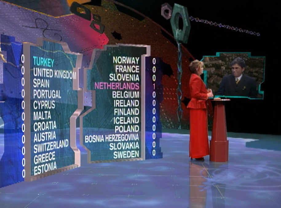 סלובניה – בשינוי מוחלט מכל מה שקרה עד כה, סלובניה במין שיר ילדים לא ברור. Regina בשמלה ירוקה ומראה כללי של גננת בפנסיה. זה שיר שמנסה להתחנף לכולם והתוצאה היא מנגינה גנרית, ילדותית ומנותקת. שיר ערש בינוני עם תזמורת שמוציאה אותו מהקשר. הצבעת השכנים מתחילה לתסכל, שכן השיר הזה מקבל את מרבית הנקודות מהשכנות בוסניה וקרואטיה ובכך נמנע ממנו להגיע למקום האחרון. אגב, היא רק בת 21 בזמן התחרות (!!!!!!).