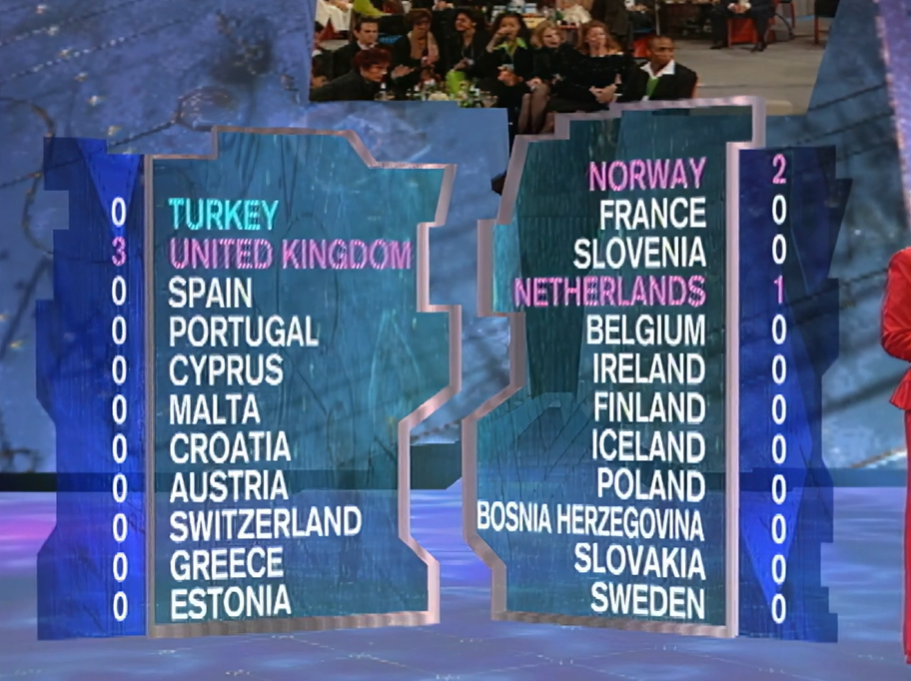 אחרי ההצבעה הטורקית, אירלנד עולה למקום הראשון. Colin Berry מעניק את הניקוד הבריטי בפעם העשרים ברציפות ואחרי ההצבעה הבריטית, אירלנד, בריטניה וקפריסין חולקות את המקום הראשון. הברדק על לוח הניקוד רב וכמעט כל המדינות מקבלות נקודות. במהלך ההצבעה הספרדית, Belén Fernández de Henestrosa הידועה לשמצה עושה 2 טעויות: היא אומרת צ'כוסלובקיה במקום סלובקיה והיא נותנת 6 נקודות ל-Holland במקום ל-Netherlands, מה שגורם למנחה להתבלבל ולתת את הניקוד ל-Poland עקב המצלול הדומה. אחרי ההצבעה הספרדית, מלטה מובילה ואחריה קפריסין. בלגיה וקרואטיה חולקות את המקום השלישי. שבדיה עודנה במקום האחרון, אך צפויה לפרוץ בקרוב. ההצבעה הפורטוגלית שוברת את ה-0 השבדי, מעלה את קרואטיה למקום הראשון, את קפריסין לשני ואת אירלנד לשלישי בתיקו עם מלטה. ההצבעה הקפריסאית מעלה את אירלנד למקום השני. ההצבעה המלטית מקפיצה את טורקיה למקום השלישי בשוויון עם קפריסין. ההצבעה הקרואטית מעלה את קפריסין ומלטה לשוויון במקום השני. ההצבעה האוסטרית מעלה את אירלנד למקום השני, מתעלמת מקרואטיה ומעלה את שבדיה מהמקום ה-20 למקום ה-16. ההצבעה השוויצרית מעלה את אירלנד בחזרה למקום הראשון, וכך זה יישאר עד סוף הערב. שבדיה עולה למקום ה-11, פורטוגל עולה למקום השלישי. ההצבעה היוונית מעלה את קפריסין למקום השני בעוד קרואטיה מתדרדרת לרביעי. ההצבעה האסטונית מתעלמת מקפריסין ומעלה את אירלנד לפער של 20 נקודות בראש לפני קפריסין.