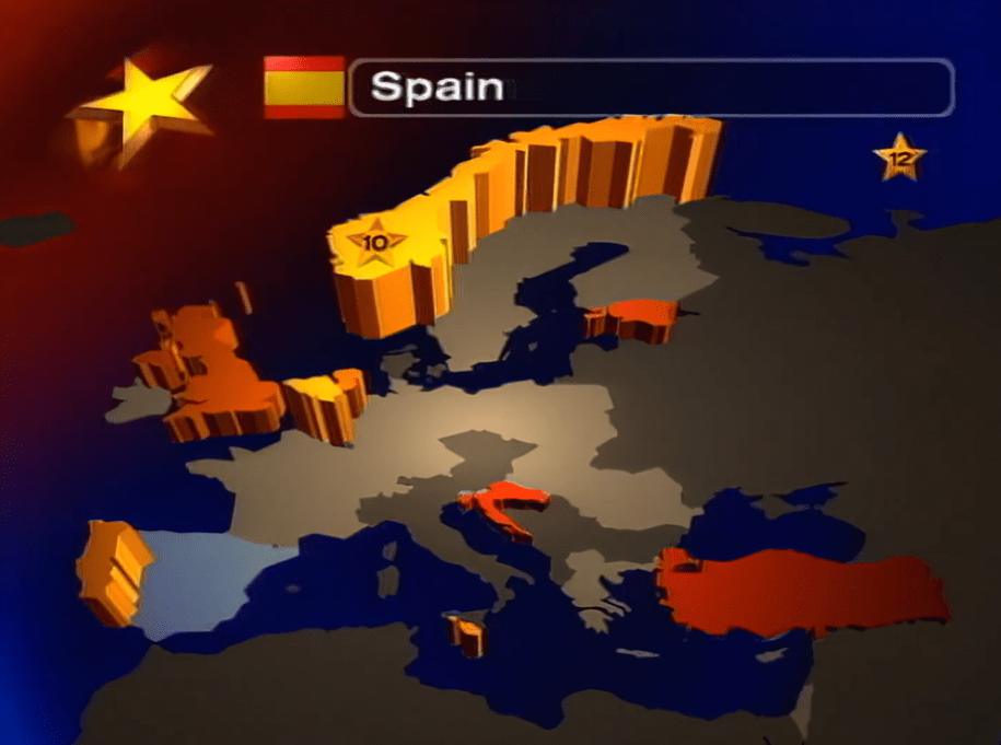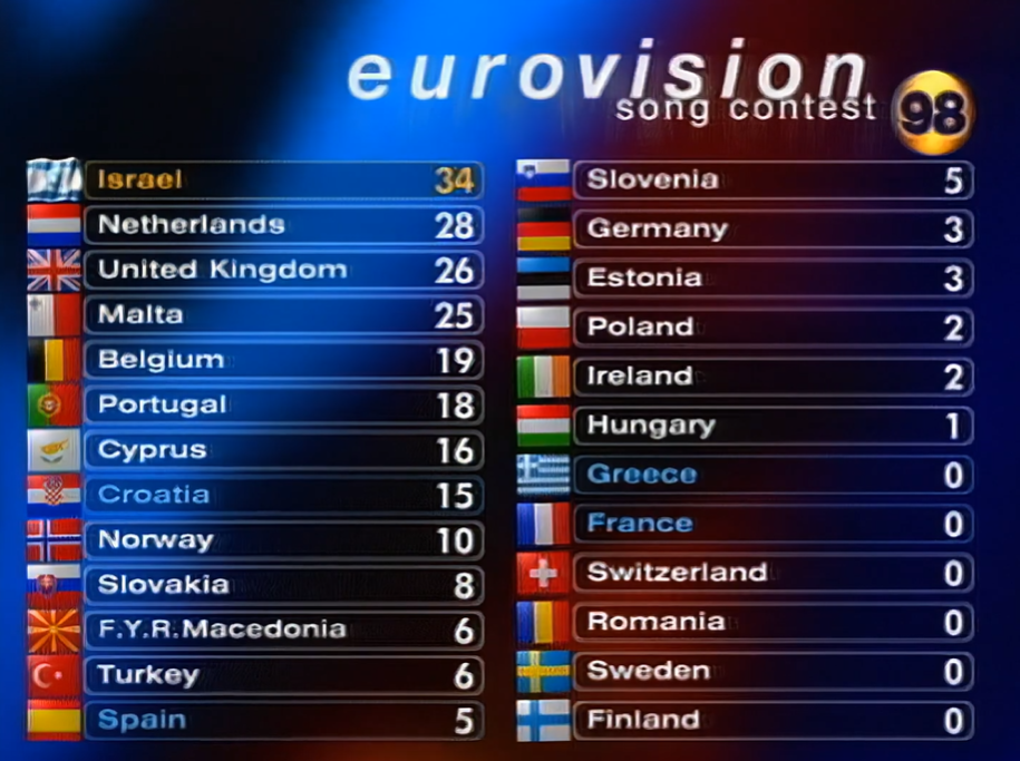 * הניקוד הספרדי שניתן בעת השידור היה מוטעה, מעניקת הנקודות נתנה את הניקוד ללא גרמניה שקיבלה מהם 12 נקודות, וכך נוצר הרושם שישראל קיבלה את 12 הנקודות מספרד. אחרי התחרות הטעות תוקנה. כתוצאה מכך גרמניה עולה למקום השביעי ואסטוניה ופורטוגל יורדות למקום ה-12.
