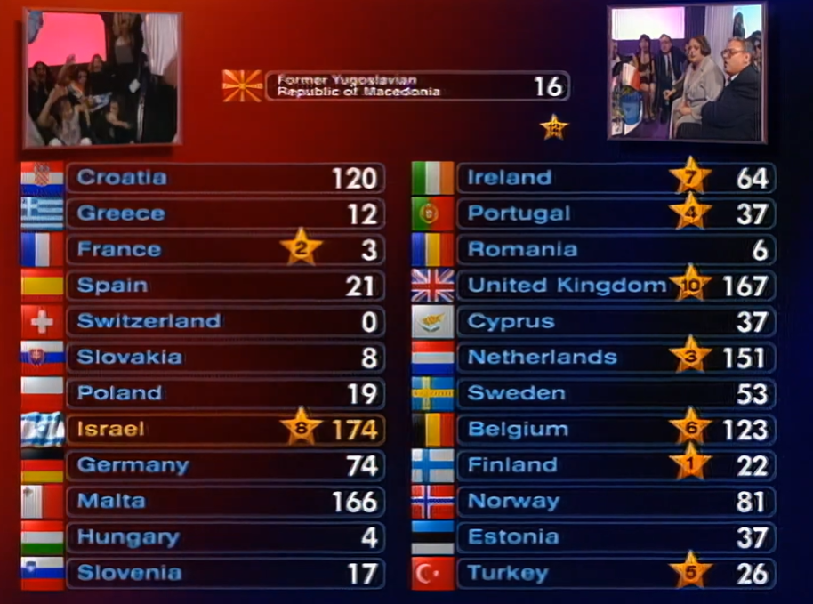 ההצבעה הקרואטית מעלה את בריטניה להובלה מוקדמת. ההצבעה היוונית מקבלת קריאות בוז אחרי 12 הנקודות לקפריסין. ההצבעה הצרפתית מעלה את הולנד למקום הראשון, כאשר בריטניה וישראל בשוויון במקום השני. אחרי ההצבעה הספרדית ישראל עולה להובלה כאשר קרובות אליה הולנד, בריטניה ומלטה. ההצבעה הסלובקית מתעלמת מישראל ומעלה את מלטה למקום הראשון. ישראל רחוקה ממנה במרחק 2 נקודות והולנד שלישית במרחק 4 נקודות מהמקום הראשון. בריטניה, שהתחילה חזק, מתחילה להתדרדר. ההצבעה הפולנית יוצרת שוויון בין מלטה וישראל במקום הראשון, כאשר אחריהן הולנד ובלגיה. ההצבעה הישראלית מציבה את מלטה לבדה במקום הראשון, כאשר אחריה הולנד ואז ישראל. בריטניה מקבלת בוסט מישראל ועולה למקום הרביעי. בלגיה וקרואטיה לא רחוקות ממנה. כרגע זה נראה כמו ראש חץ של לא פחות מ-6 מדינות. ההצבעה הגרמנית מעלה את ישראל לשוויון במקום השני עם הולנד. ההצבעה המלטית מחזירה את ישראל למקום הראשון, כאשר קרובות אליה כרגע מלטה, הולנד וקרואטיה. ההצבעה ההונגרית מתעלמת מישראל ומעלה להובלה את הולנד. בלגיה מתחילה להתרחק וראש החץ שנוצר מצטמצם ל-5: הולנד-מלטה-ישראל-בריטניה-קרואטיה. ההצבעה הסלובנית מתעלמת מהולנד ויוצרת דרמה בצמרת: הולנד וישראל מובילות עם 78 נקודות כל אחת, במקום השלישי מלטה וקרואטיה עם 77 נקודות, בריטניה חמישית עם 72. ההצבעה האירית מחזירה את מלטה למקום הראשון, נקודה אחת מעל הולנד ו-5 נקודות מעל ישראל. ההצבעה הפורטוגלית מעלה את ישראל למקום הראשון, נקודה אחת מעל הולנד ו-2 נקודות בלבד מעל מלטה! ההצבעה הרומנית מתעלמת מהולנד, קרואטיה ומלטה ומעלה את בריטניה למקום השני בשוויון עם הולנד. קרואטיה מתנתקת מראש החץ שהוא כעת ארבע ראשי: ישראל-הולנד-בריטניה-מלטה. ההצבעה הבריטית מעלה את מלטה למקום השני רק 2 נקודות אחרי ישראל. ההצבעה הקפריסאית מתעלמת מהולנד. תקרית מביכה בהצבעה ההולנדית והפירוט בפרטי הטריוויה למטה… אחרי ההצבעה ההולנדית, הולנד עצמה מתנתקת מראש החץ, אך היא תחזור בהמשך. ישראל ומלטה במרחק 5 נקודות זו מזו, אך רחוקות מהשאר. בריטניה במקום השלישי במרחק 14 נקודות מישראל. ההצבעה השבדית ואז הבלגית נותנות בוסט להולנד ומחזירות אותה למרוץ. היא עולה למקום השלישי על חשבון בריטניה. ההצבעה הפינית מגדילה את הפער של ישראל, היא כעת במקום הראשון במרחק 11 נקודות ממלטה. ההצבעה הנורבגית נותנת רק 3 נקודות לישראל ופותחת את התחרות מחדש כשהיא נותנת את ה-12 נקודות למלטה רק 2 נקודות אחרי ישראל. ראש החץ הוא כעת ישראל-מלטה בלבד, אבל בריטניה עוד צפויה לפרוץ בדקה ה-90. ההצבעה האסטונית מעלה את בריטניה למקום השלישי. ההצבעה הטורקית היא לפני האחרונה ומעלה את מלטה למקום הראשון, נקודה אחת על ישראל. בריטניה עושה פריצה של הרגע האחרון. בעת ההצבעה המקדונית, החל מה-6 נקודות, כל ניקוד גורם ל-gasp מהקהל. 8 הנקודות של מקדוניה לישראל גורמות לשאגות אכזבה מהקהל, טרי ווגן מכריז לצופי ה-BBC שמלטה זכתה. 10 נקודות דוחפות את בריטניה למקום השני. המסך מתפצל ומעל לוח הניקוד אנו רואים את המשלחת הישראלית וזו המלטית מחכות לשמוע האם מלטה קיבלה את 12 הנקודות. מקדוניה מכריזה "And finally the 12 points from Macedonia goes to Croatia". המשלחת הישראלית קופצת מהתרגשות, הקהל שואג משמחה.