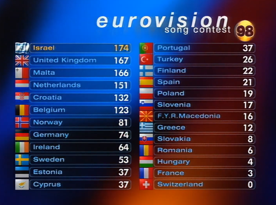 * שוויץ מסיימת עם 0 נקודות ומצטרפת לליטא 1994, פורטוגל 1997 ונורבגיה 1997 כמדינות עם התוצאה הגרועה ביותר עד כה – 24 מנקדים פוטנציאלים לכל אחד ואף לא נקודה אחת לאף אחד מהם. עבור שוויץ מבחינה סטטיסטית זו התוצאה הגרועה ביותר עד לימינו אנו, וזאת למרות שכבר סיימה בעבר במקום האחרון עם 0 נקודות ועוד תסיים בעתיד במקום ה-25 אך עם נקודות.