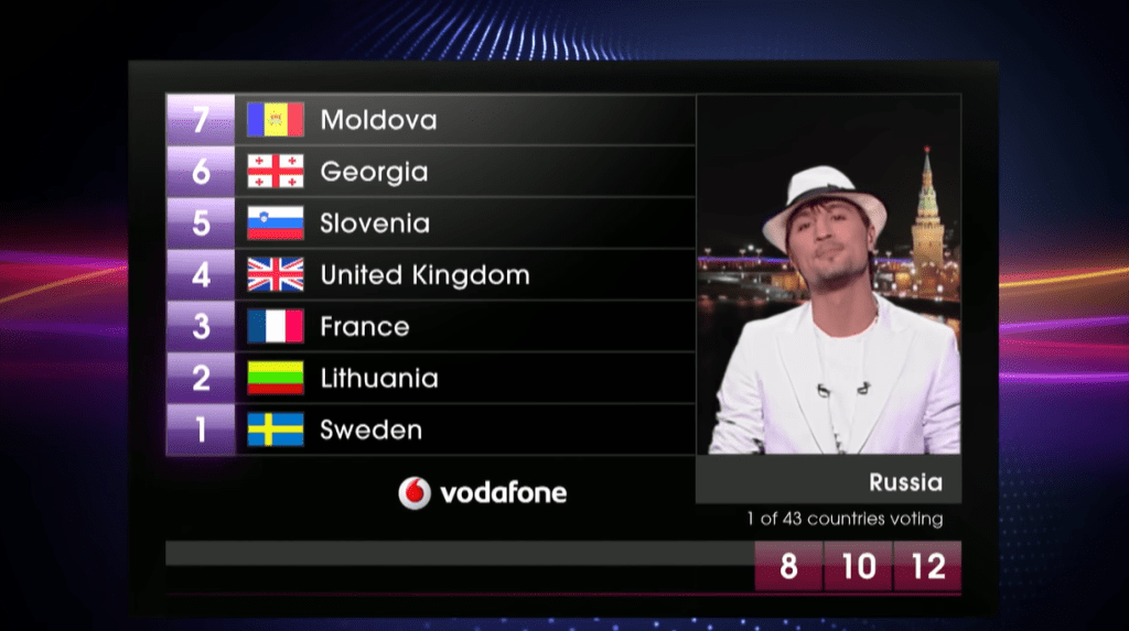 * בחצי הגמר הראשון יוון מקבלת נקודות מ-19 מדינות, אזרבייג'ן מ-17 מדינות, ורוסיה ופינלנד מ-15 מדינות. בחצי הגמר השני שבדיה מקבלת ניקוד מהכי הרבה מדינות 20 מדינות בסך הכל. דנמרק מקבת נקודות מ-19 נקודות, רומניה מקבלת נקודות מ-17 מדינות. בגמר שבדיה שומרת על הבכורה על 32 מדינות מצביעות. אחריה איטליה ואזרבייג'ן עם 30 מדינות מצביעות ובריטניה עם 25 מדינות מנקדות.