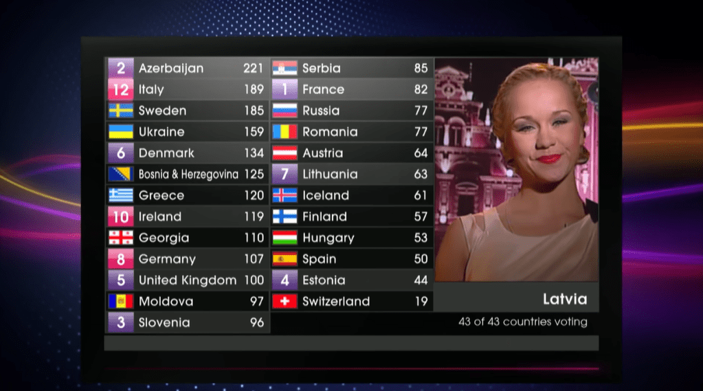 רוסיה ראשונה להצביע, אזרבייג'ן הראשונה להוביל. לאחר ההצבעה הבולגרית, יוון, אוקראינה ובריטניה בשוויון במקום הראשון. אחרי ההצבעה ההולנדית, דנמרק מובילה בנקודה על אזרבייג'ן ויוון. ההצבעה האיטלקית שמה את בריטניה במקום הראשון ואחריה אוקראינה ורומניה. ההצבעות מטורפות, כשהכל משתנה ברמת הדקה. ההצבעה הקפריסאית מעלה את יוון למקום הראשון, כאשר בריטניה ואוקראינה בשוויון במקום השני ואזרבייג'ן עולה לרביעי. ההצבעה האוקראינית מעלה את אזרבייג'ן למקום השני. לאחר ההצבעה הפינית, אירלנד מקבלת בוסט, בעוד אזרבייג'ן עולה למקום הראשון. ההצבעה הנורבגית מעלה את שבדיה למקום השני בשוויון עם יוון. ההצבעה הארמנית הופכת את העניינים לצמודים במיוחד כאשר יוון עולה להובלה עם 45 נקודות, שבדיה ואוקראיה שניות עם 42 נקודות ואזרבייג'ן רביעית עם 41 נקודות. ההצבעה המקדונית מעבירה את הובלת הטבלה לאוקראינה, שבדיה ויוון שניות, בריטניה ואזרבייג'ן רביעיות. בוסניה מוקפצת למקום השישי, והקהל צועק בבוז. ההצבעה האיסלנדית מעלה את שבדיה למקום הראשון ואת אזרביג'אן לשני. חשוב לציין שלאחר 11 הצבעות איטליה מדשדשת במקום ה-21 (!), אך כל זה עומד להשתנות. ההצבעה הסלובקית מכניסה את אירלנד לטופ 10 ומעלה את אוקראינה למקום השני. ההצבעה הבריטית מעלה את שבדיה בחזרה למקום הראשון. ההצבעה הדנית מכניסה את גרמניה לטופ 10 ומגדילה הפער לטובת שבדיה. אירלנד עולה למקום הרביעי, איטליה צוברת נקודות לאט. לאחר ההצבעה האוסטרית, אזרביי'אן עולה למקום השני. ההצבעה הפולנית מעבירה את איטליה לצד השמאלי של טבלת הניקוד. בהצבעה השבדית, Danny Saucedo שהפסיד ל-Eric Saade במלודיפסטיבלן, מעניק את הניקוד כשהוא לבוש בחולצה עם תמונה של Saade עליה. חמוד. שתי ההצבעות האחרונות מצמצמו את הפער בין שבדיה לאזרבייג'ן ל-2 נקודות. ההצבעה השבדית מקפיצה את אירלנד למקום השלישי. ההצבעה הסן מרינאית מעלה את אזרבייג'ן למקום הראשון ולראשונה את איטליה לטופ 10. ההצבעה הגרמנית מתעלמת משבדיה ומאזרבייג'ן. ההצבעה האזרבייג'נית מעלה את שבדיה בחזרה למקום הראשון ואת אוקראינה למקום הרביעי. ההצבעה הסלובנית מעלה את דנמרק למקום השלישי. יותר ממחצית מהמדינות הצביעו. Rakers מראיינת בגרין רום את Eric Saade, המוביל בשלב זה. ריקאפ של הטופ 3 מהמקום השלישי לראשון – דנמרק, אזרבייג'ן ושבדיה. ההצבעה הטורקית מעלה את אזרבייג'ן למקום הראשון, שם תישאר המדינה עד לסוף הערב, ואת אוקראינה לשלישי. איטליה יוצאת מהטופ 10. ההצבעה השוויצרית מתעלמת משבדיה ומעלה את בוסניה והרצגובינה למקום השלישי. ההצבעה היוונית מחזירה את אוקראינה למקום השלישי ומחזירה את איטליה לטופ 10. ההצבעה הגיאורגית מעלה את שבדיה למקום השני ואת איטליה לשישי. ההצבעה הסרבית מתעלמת מאזרבייג'ן ומעלה את אוקראינה לשוויון במקום השני עם שבדיה. ההצבעה הקרואטית מעלה את בוסניה והרצגובינה לשוויון במקום השני עם אוקראינה, כאשר שבדיה יורדת לרביעי. ההצבעה הבלרוסית שוברת את המסורת של עצמה ונותנת ניקוד נמוך לרוסיה. אוקראינה לבדה במקום השני בעוד שבדיה בשלישי. ההצבעה הרומנית מעלה את איטליה למקום החמישי ופותחת עבור אזרבייג'ן פער יפה במקום הראשון. ההצבעה האלבנית כבר מביאה לפער של 18 נקודות בין אזרבייג'ן לאוקראינה שעולה למקום השני. בוסניה עולה לשלישי, בעוד שבדיה זוכה להתעלמות. ההצבעה המלטית מחזירה את שבדיה למקום השלישי, בעוד אזרבייג'ן מגדילה את הפער במקום הראשון ל-26 נקודות בינה לבין אוקראינה. ההצבעה הפורטוגלית מעלה את איטליה למקום הרביעי. ההצבעה ההונגרית מתעלמת מאוקראינה. ההצבעה הליטאית מתעלמת מאוקראינה ושבדיה ומעלה את איטליה למקום השלישי. ההצבעה הבוסנית כבר מעלה את איטליה למקום השני ואת שבדיה לשלישי. ההצבעה הספרדית מתעלמת מאזרבייג'ן ומצצמת בכך את הפער בינה לבין איטליה. ההצבעה הישראלית מתעלמת מאיטליה ומעלה את שבדיה למקום השני. ההצבעה האסטונית מעלה את דנמרק למקום החמישי שם תישאר. כעת רק שבדיה 